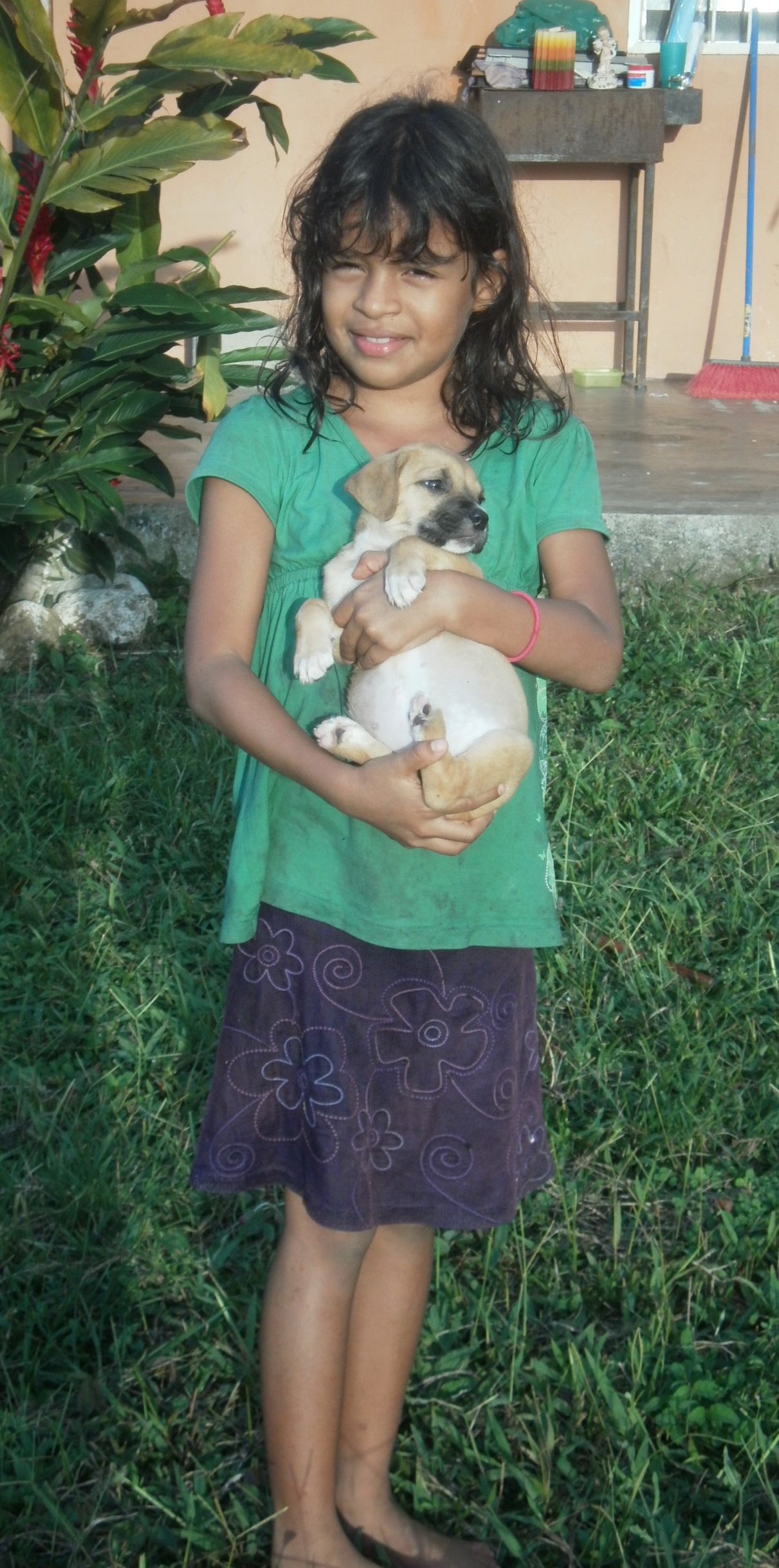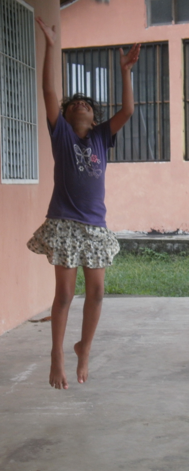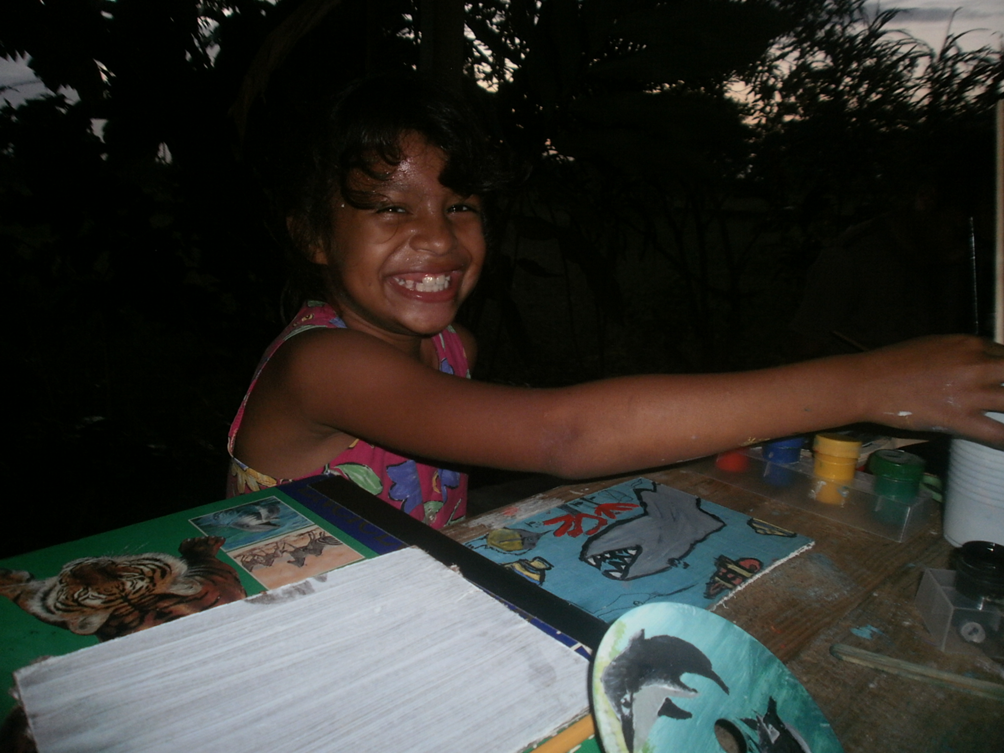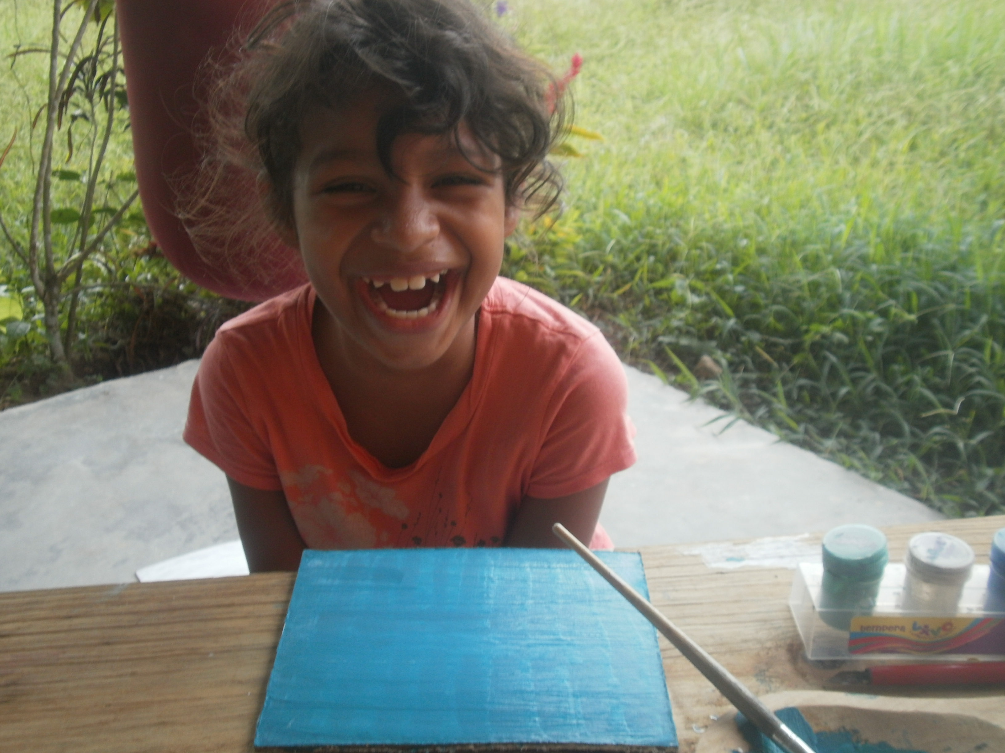 Last Friday while the kids were in homeschool with Darwin I set about transforming our porch into an afternoon art studio. I set up two wooden tables with painting and art supplies and another small table with our cd player, a plastic vase with a few freshly-cut flowers, our camera which the kids love to use, and a bowl full of fresh coconuts ready for snacking. To finish off the prep work, I pinned up a sign that read “Welcome to the Peaceful and Creative Place.” Throughout the afternoon the kids worked on painting projects, cracked open coconuts, took photos, and danced around our large porch. The following photos were taken by the children and me that afternoon.