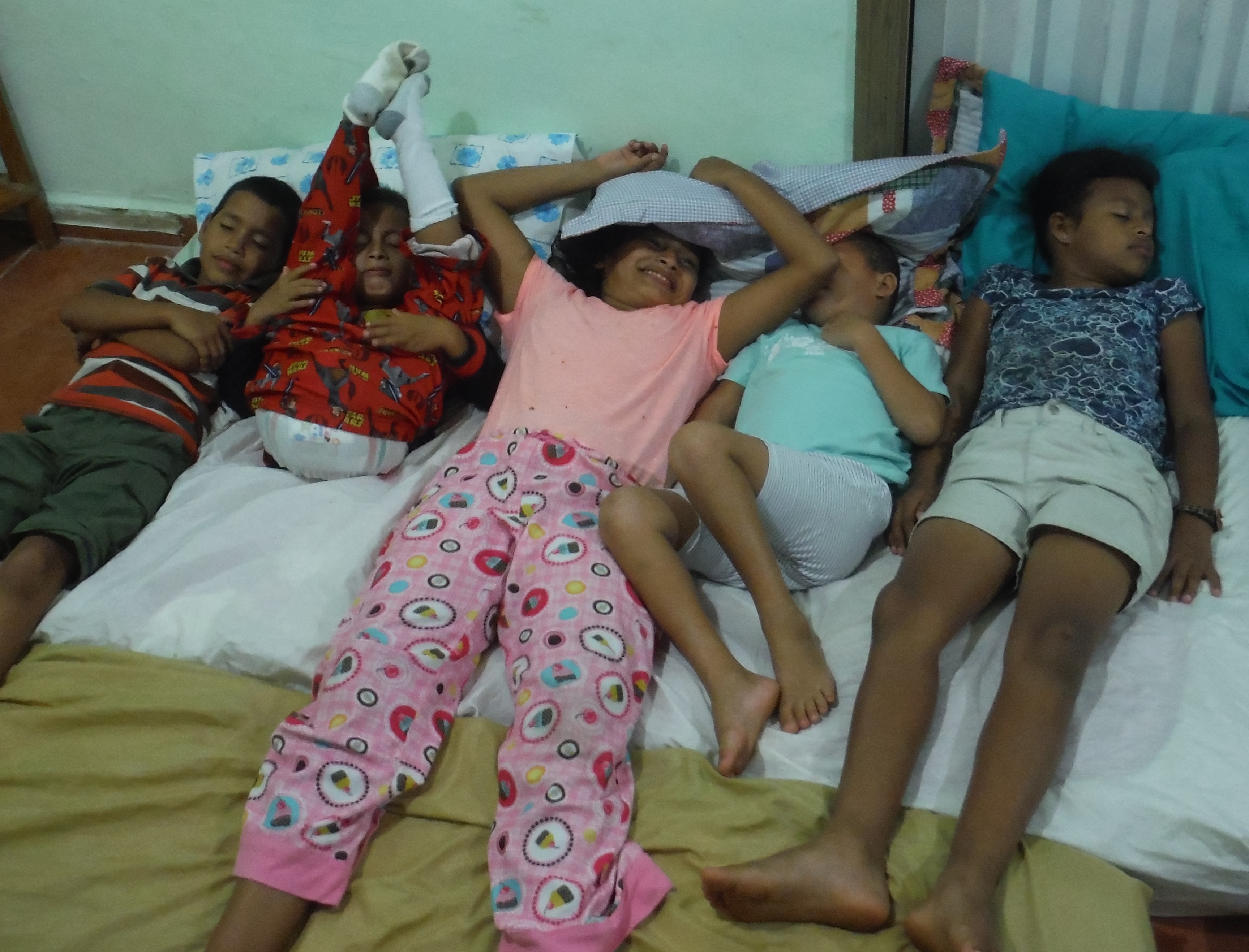 Several nights ago as we were getting ready to watch a movie together as a family, everyone was in and out of the shower, brushing teeth and generally quite frenzied as we were all bringing pillows, stuffed animals and blankets for the big event in our living room. As I walked out of our bedroom, I laughed out loud as I saw five little monkeys pretending to be asleep (our eldest was not present and Josselyn had not yet arrived to live with us).
