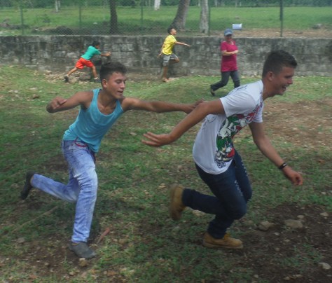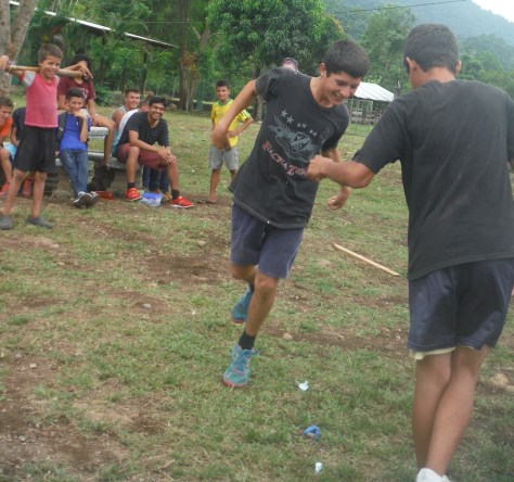 Watch out, Jackeline! Your teacher is gaining on you! Run, Reina, run! (She was such a good sport — she came out on one of her days off in order to participate in all the games with the kids without having any idea what would be in store!)
