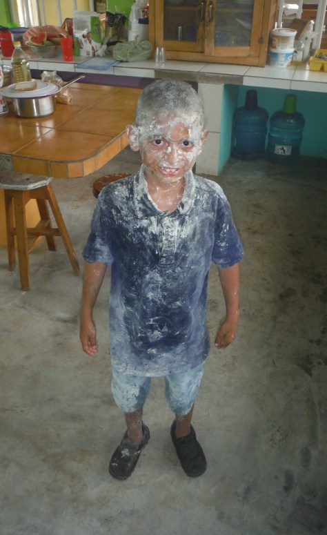 Watch out, kids! Here comes Darwin with a huge spoonful of flour! Run and hide!