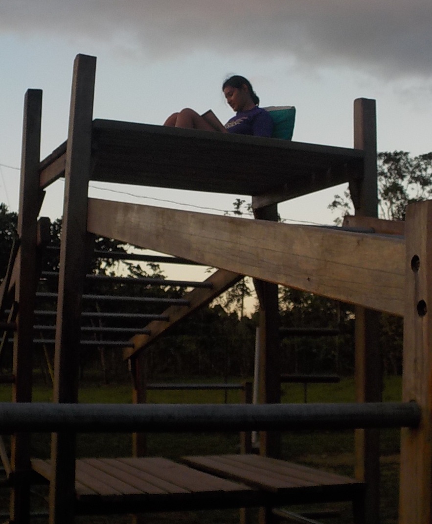 A couple days ago after our discipleship-based community homeschool classes had let out at 3:00pm and our local students had returned to their homes in our rural neighborhood, I crossed our quiet front yard and caught sight of our 14-year-old foster daughter reading a Christian novel while perched on top of our large play structure that is normally swarmed with kids during recess time. It warmed my heart to see her so still and at peace while reading for pleasure (she used to hate reading, and we’ve been intentionally working on this not only with her but with all of our kids), and the sight of her way up there overlooking the beautiful pastures inspired me to go grab our little digital camera and take a few undercover photos of her…