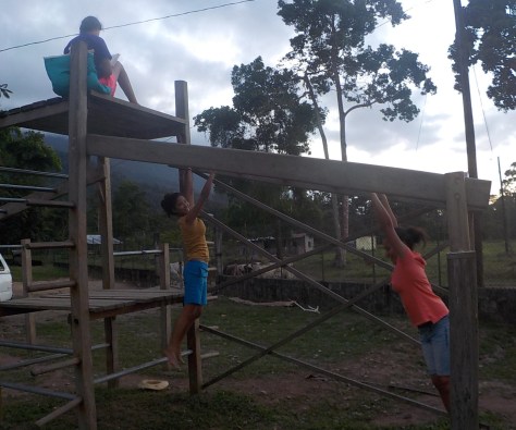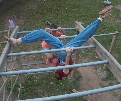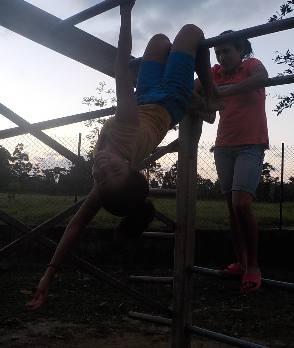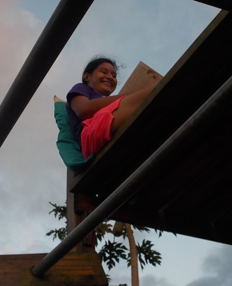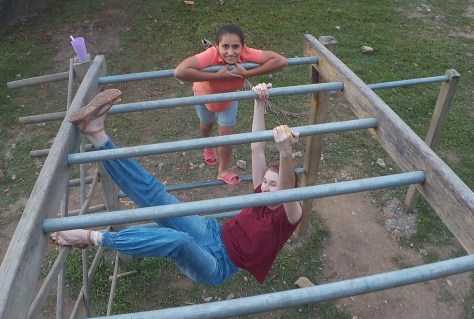 When I got up close for one of my shots of her, my cover was broken and she started laughing when she saw me!Our 15-year-old foster daughter Carolina — who moved in with us about six months ago — watched from close by and laughed while enjoying our spontaneous photo-taking antics.Soon enough both Carolina and another foster daughter of ours, 14-year-old Paola, joined in the fun and started swinging on the monkey bars below Jackeline’s reading spot. (Great focus, Jackeline! She just kept on reading as if they weren’t there!)The jungle gym is not only for little kids, but also for teens! Our kids are very playful……And so are their parents! Now it’s my turn! (At this point Jackeline’s taking photos from her perch!)