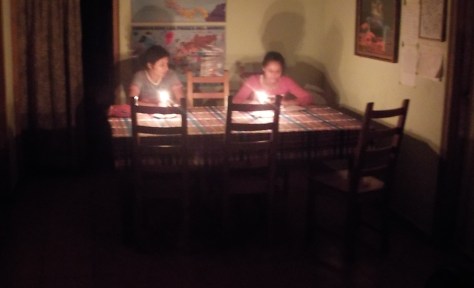 Some of our foster teens and local students helping shovel gravel during a day of organized maintenance/construction activitiesTwo of our girls doing their homework by candlelight in our living room. Our kids make fun of me because I’m very old-fashioned!