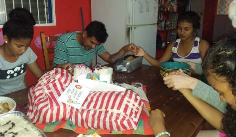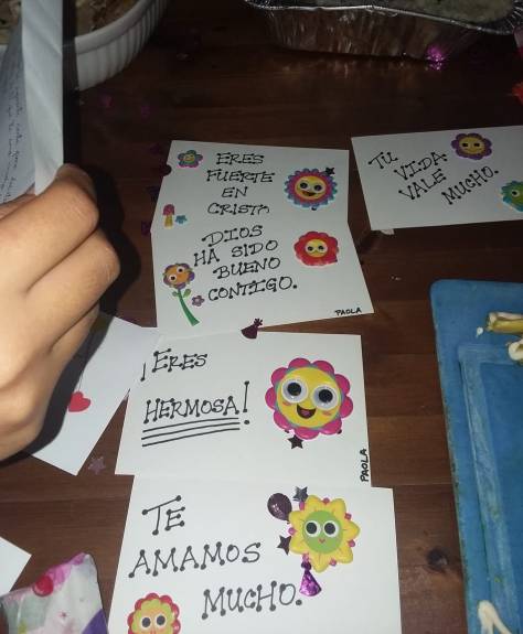 Waiting for their little piece of cake!One of our local students, an 8th-grader, explains his recent science project to a group of onlookers.This is my husband Darwin with a group of his English class students on a special field trip into the city of La Ceiba to eat pizza. Some of our local students never get out of our little rural town, so experimenting a change of environment tends to be very exciting. (One of our local teens had never seen the ocean even though the nearest beach is only a few miles away from our town. That was remedied as Darwin organized a large group field trip out to the beach earlier this year.)This is Jeffrey, a local 15-year-old youth who has been in our school for the last several years. Currently in 4th grade, he has several developmental delays and comes from a severely disintegrated home, as his father and one of his brothers left earlier this year for the United States, leaving him, his mother and two of his brothers behind. Jeffrey requires a lot of individualized attention as he has dislexia and ADHD, and my husband Darwin has a very soft spot for him. We are very proud of Jeffrey for choosing to stay in school and be exposed to daily biblical teaching, as it is very popular for teenage boys in our neighborhood to simply roam the streets or get mixed up in trouble.This is a photo taken in Darwin’s group piano class earlier this month. Music is a fundamental element we try to inculcate in all of our students as part of their integral development, healing from past traumas, and preparation for life and God’s service.Whenever our foster children have a birthday, we like to take the opportunity to write them love letters and little notes of affirmation and encouragement. These specific index cards were part of 16-year-old Paola’s celebration, and a few of them read “You are strong in Christ,” “Your life is of great worth,” “God has been good to you,” and “You are beautiful!”Birthday parties are so much more fun with disguises!