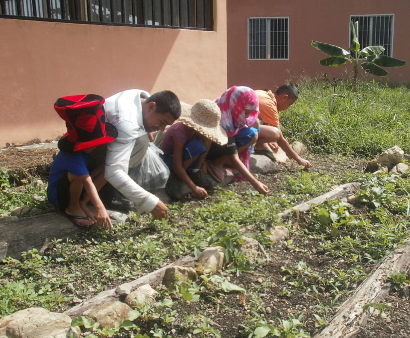 The other day I came out of the kitchen to find Darwin crouched down with the four kids plucking weeds from the pepper garden. Check out their hats!