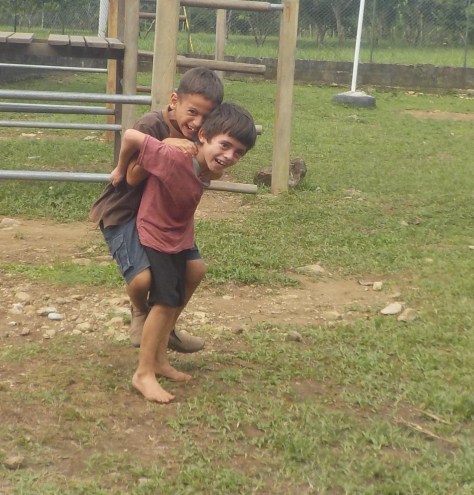 Our 9-year-old special needs son Josue and 7-year-old Ever (the youngest son of our night watchman) trying to figure out how to do “backpack”!