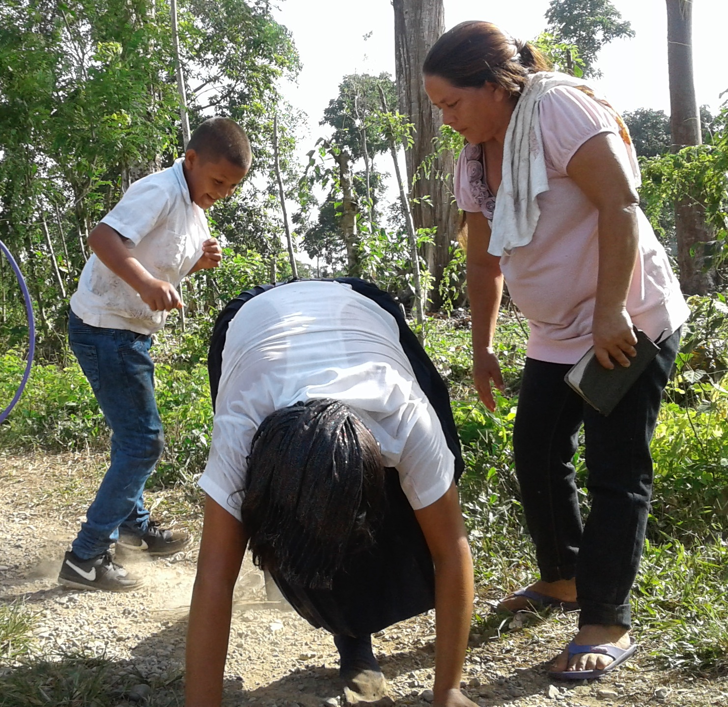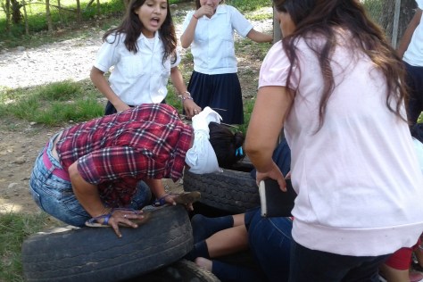 The plaid shirt belongs to 34-year-old Geraldina, the local Christian woman who serves with us in cooking and cleaning and is in one-on-one literacy classes as she learns to read and write for the first time in her life. She exhibited incredible bravery as she crossed the pile of tires without being able to see where she was going! (And they kept moving the tires as she tried to pass in order to make it more difficult.)