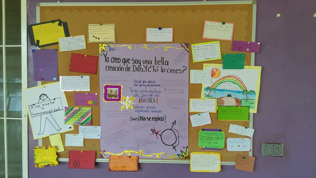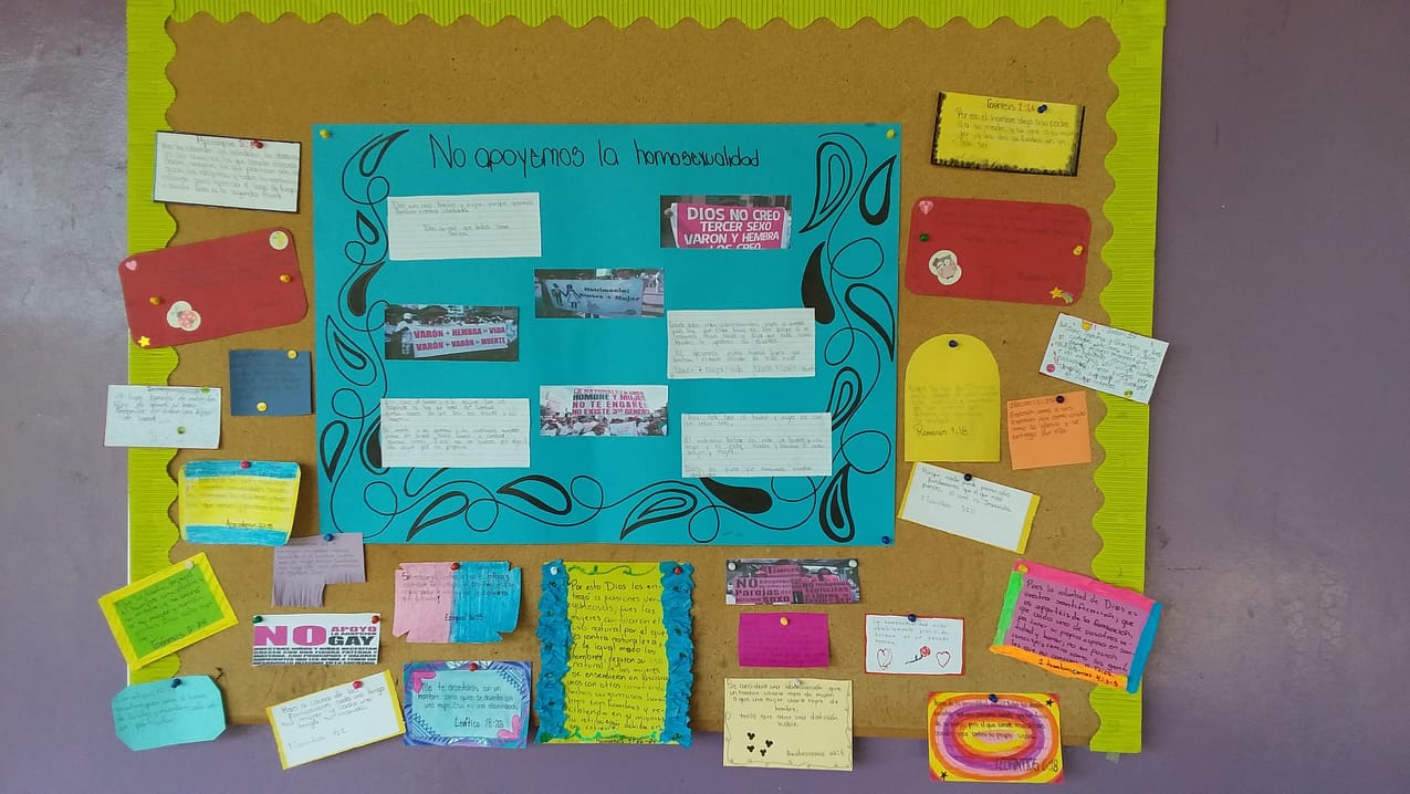 Several weeks ago I began teaching an intensive World Geography class to all of our students, focusing on current world trends and how we should react to said trends from a God-honoring standpoint. A recent topic for the class was the ever-increasing LGBT influence around the globe and how we as Christians should stand firm on the Bible’s clear teachings concerning homosexuality and God’s design of man and woman, biblical marriage, etc. As part of the class curriculum I asked all of our students to look up Bible verses specifically addressing these gender- and identity- issues, and to write them on index cards, poster boards, etc, in a loving and clear way with the goal of communicating truth and edifying one another as God created them. We have since filled two of our school’s bulletin boards with this precious information, and we continue to influence our students and foster kids to live a God-honoring life, not giving in to what the world claims is normal but rather standing firm on the Rock of truth.