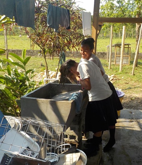 Here’s one of our foster daughters helping a local student wash her hair! We don’t want any parents mad at us because their kids smell like rotten egg!