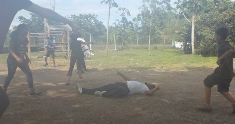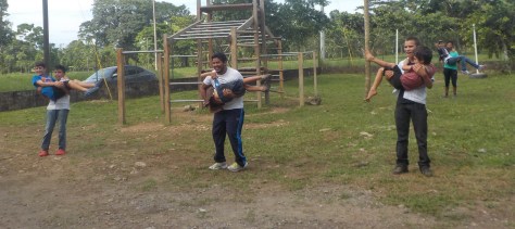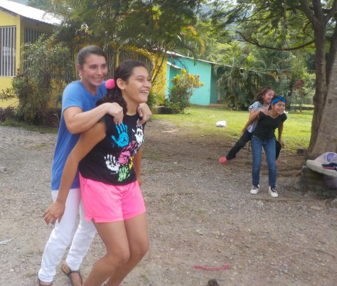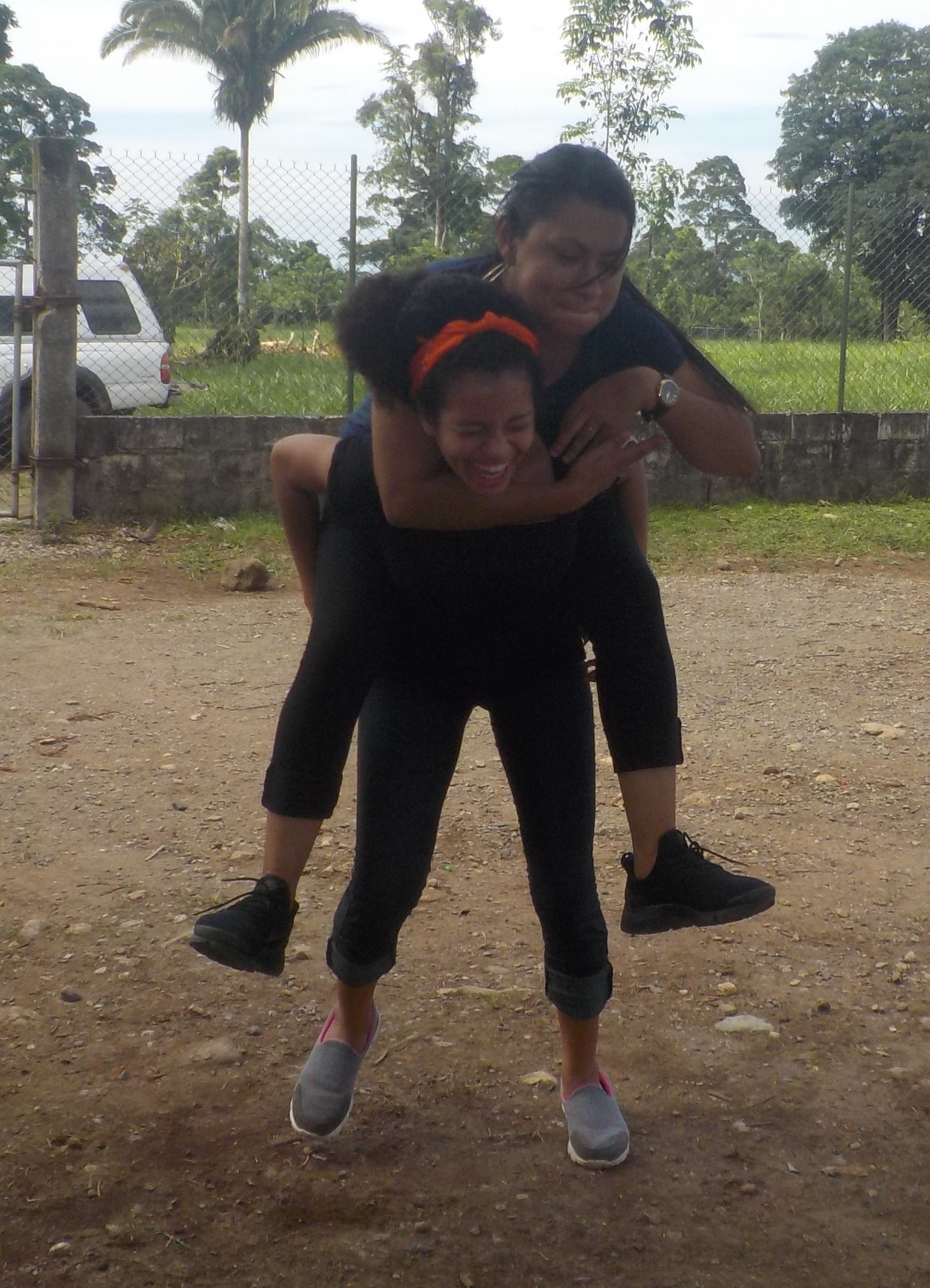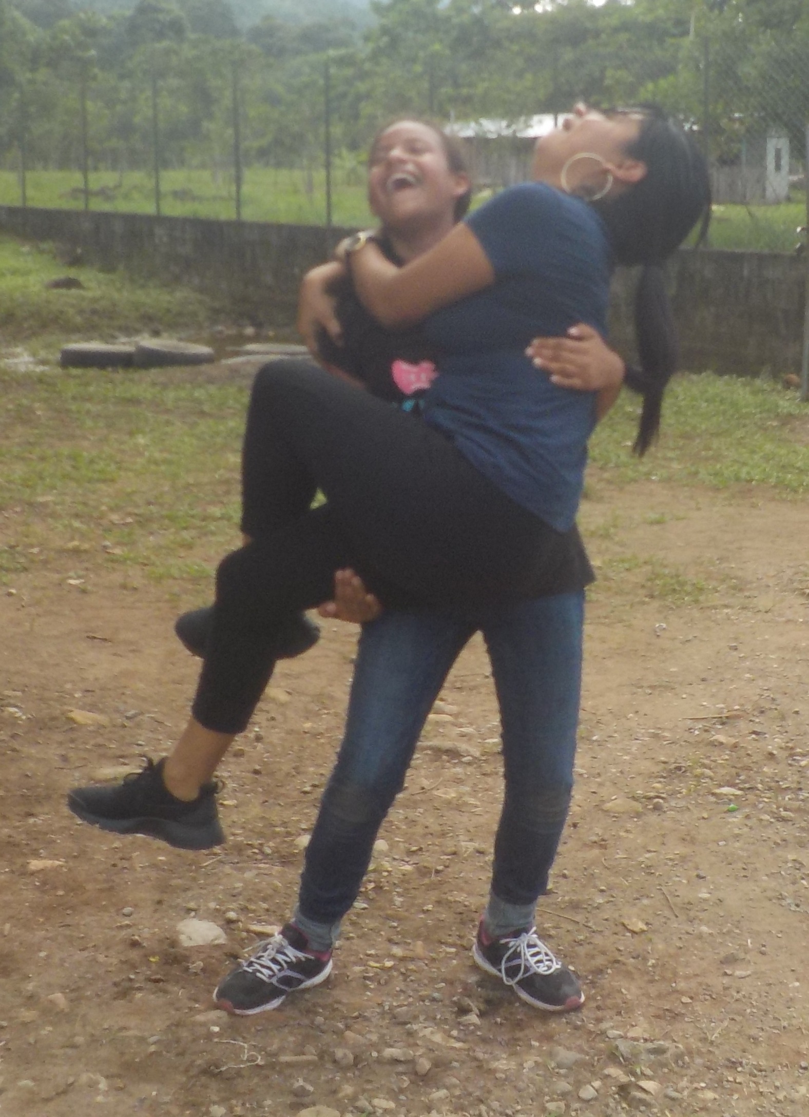 Way to go, boys! (This is the “baby” position). Erick, who serves not only at the Living Waters Ranch with us but also in our rural neighborhood alongside of his wife in relationship discipleship, played hard on Friday afternoon right alongside of all the kids and teens.Here are two of our teachers (Isis, far left and Ligia, far right) participating in the “baby” posiiton with our girls!Jackeline holding Sandra’s mom in the “baby” position! (How silly! What a big baby!)Of all the photos we took on Friday, I believe this is my favorite of all, because it shows just how hard Geraldina was laughing throughout all the activities. She — not only her teenage daughter — is finding healing, acceptance and joy as the Lord is filling and freeing her in new ways. (She was laughing like this on and off throughout the whole afternoon, and she later told us that she had never laughed so hard or felt so joyful).Here is our 17-year-old daughter Dayana (whom we are in the process of legally adopting) carrying her teacher in the “backpack” position!Hurry up! Now everybody’s got to change positions! Now it’s “baby”! (Gotta love Miss Ligia’s face as she tries to pick Dayana up.)Ariel, one of our local teens, carrying Erick as his “backpack”!Our 9-year-old special needs son Josue and 7-year-old Ever (the youngest son of our night watchman) trying to figure out how to do “backpack”!Josue needed to pick Ever up (because he’s bigger and older), but Josue decided to be the “baby”!Elalf and Donaris, two of our local male students, enjoying the “baby” position! Everyone was cracking up as we constantly changed from one position to another!Erick holding Roy, one of our 18-year-old local students. What a precious baby!Now switch! (Erick is now Roy’s baby!)Our daughter Gleny trying to hold up Miss Ligia, her teacher!Another game we played on Friday was a leg-wrestling type of match standing up. You have to try to get your partner to lower their raised-up foot! Sandra went up against her mom, Geraldina!Sandra and her momOur daughter Jackeline competing against Dayra, a local student.This hilarious shot was taken during an intense match of Chinese freeze tag. Erick wiped out!Next up, we’re gonna make a big circle and pass a ton of basketballs and volleyballs around clockwise. If you let one drop, you’re out! (The circle gets smaller and smaller, and everyone is passing balls one right after the other.) This is great for teamwork and hand-eye coordination!