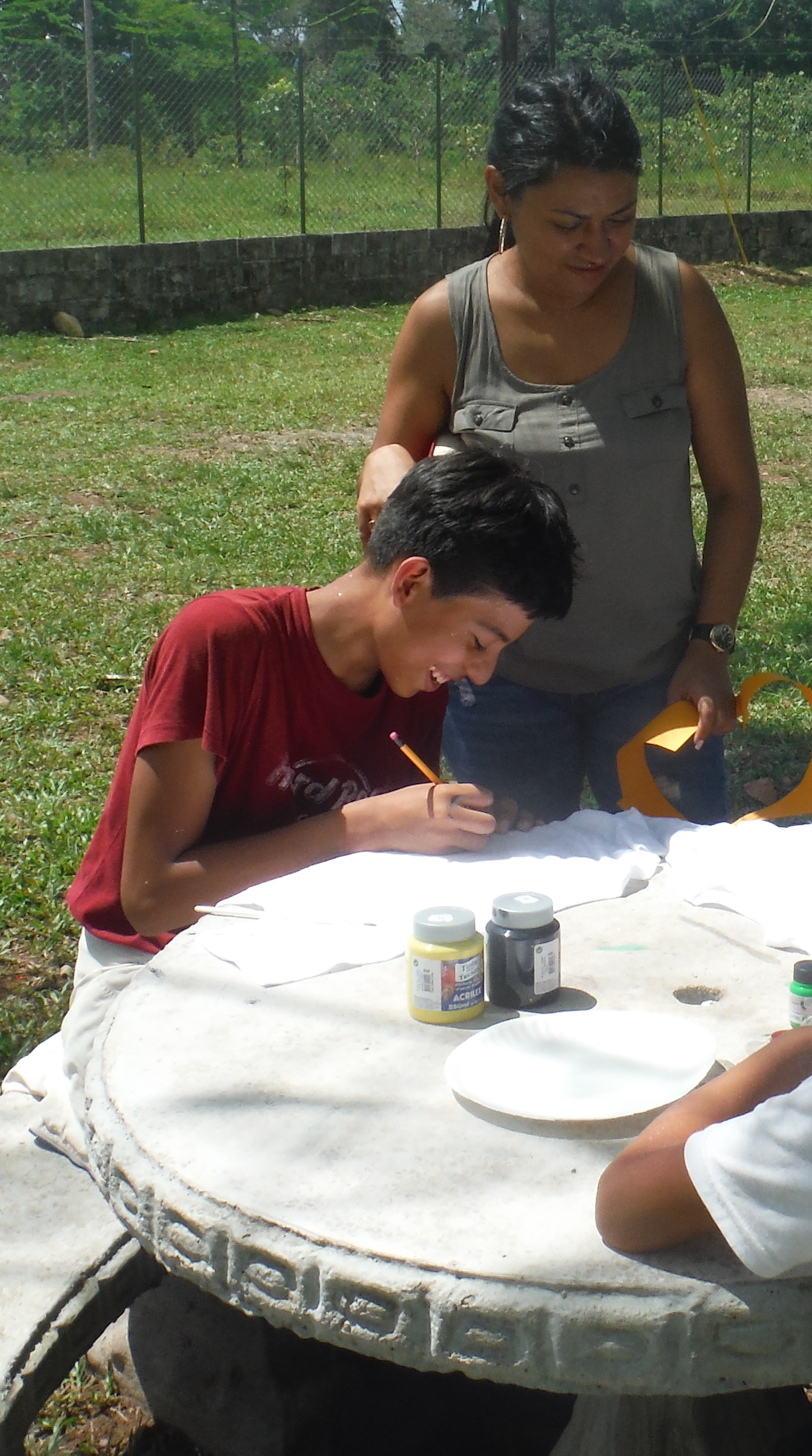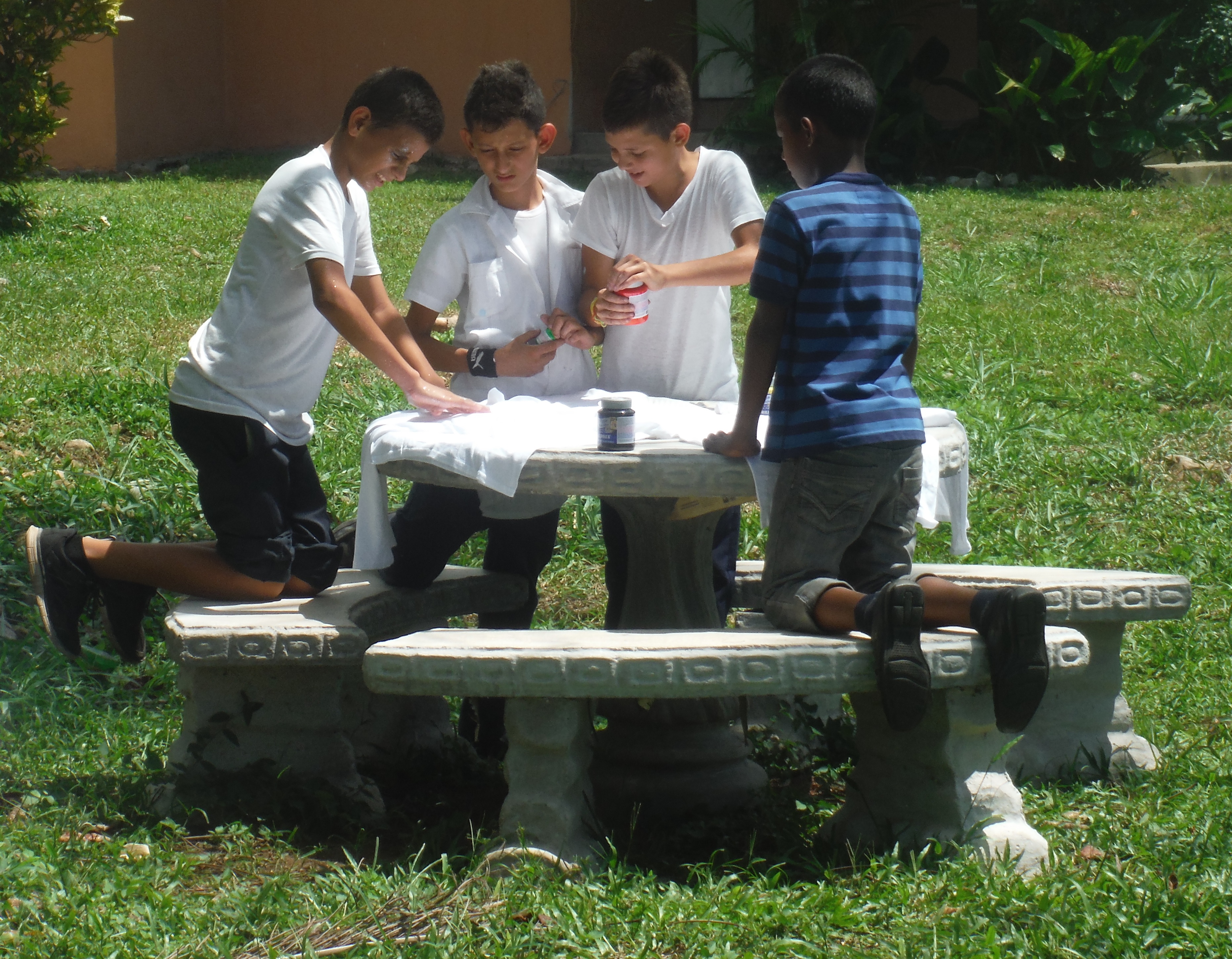 Miss Ligia and Darwin in our front yard with a few of the Art Club students painting t-shirts at one of our concrete tables