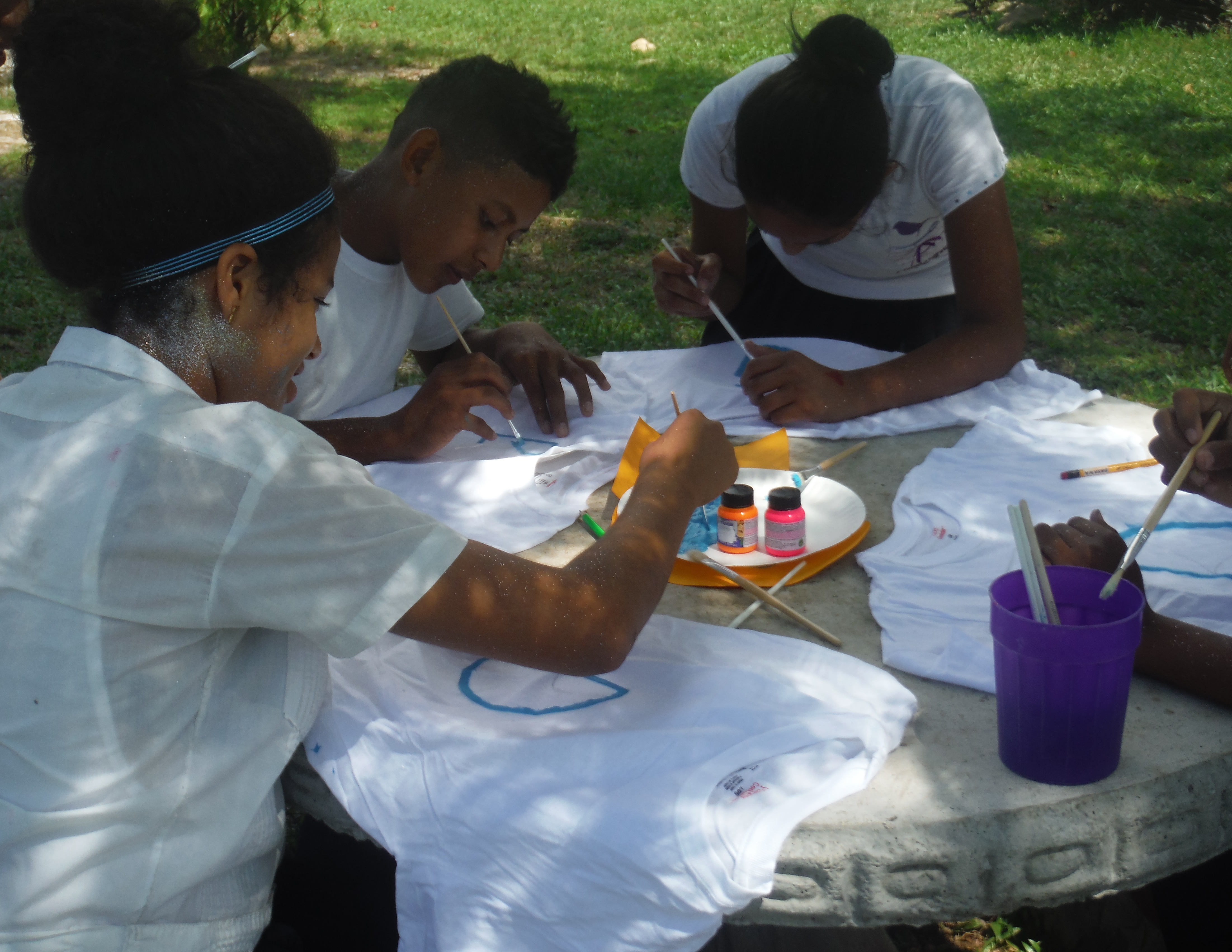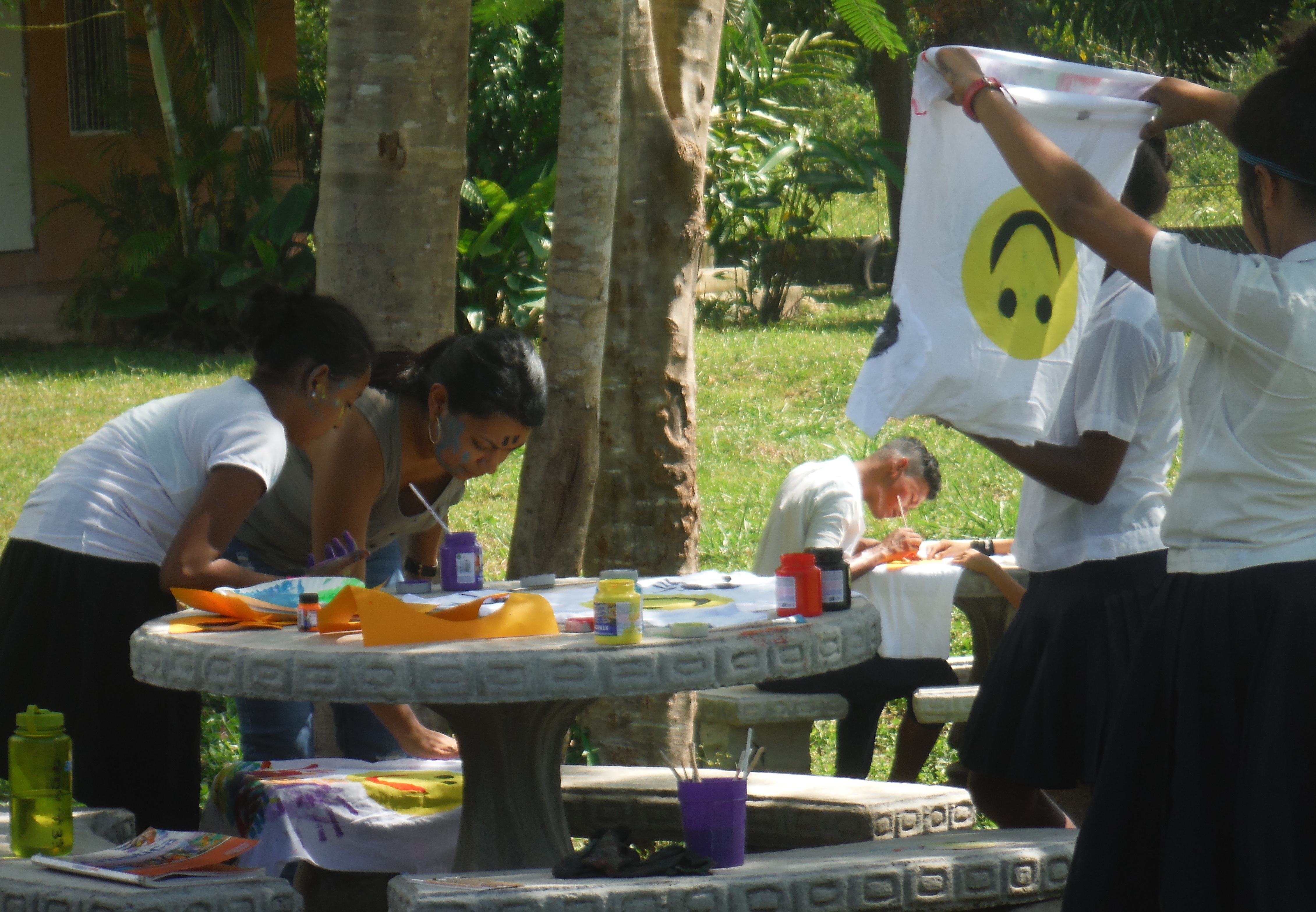 Our 15-year-old daughter Dayana with local students Stanley and Sindy as all three paint t-shirts during their first Art Club meeting
